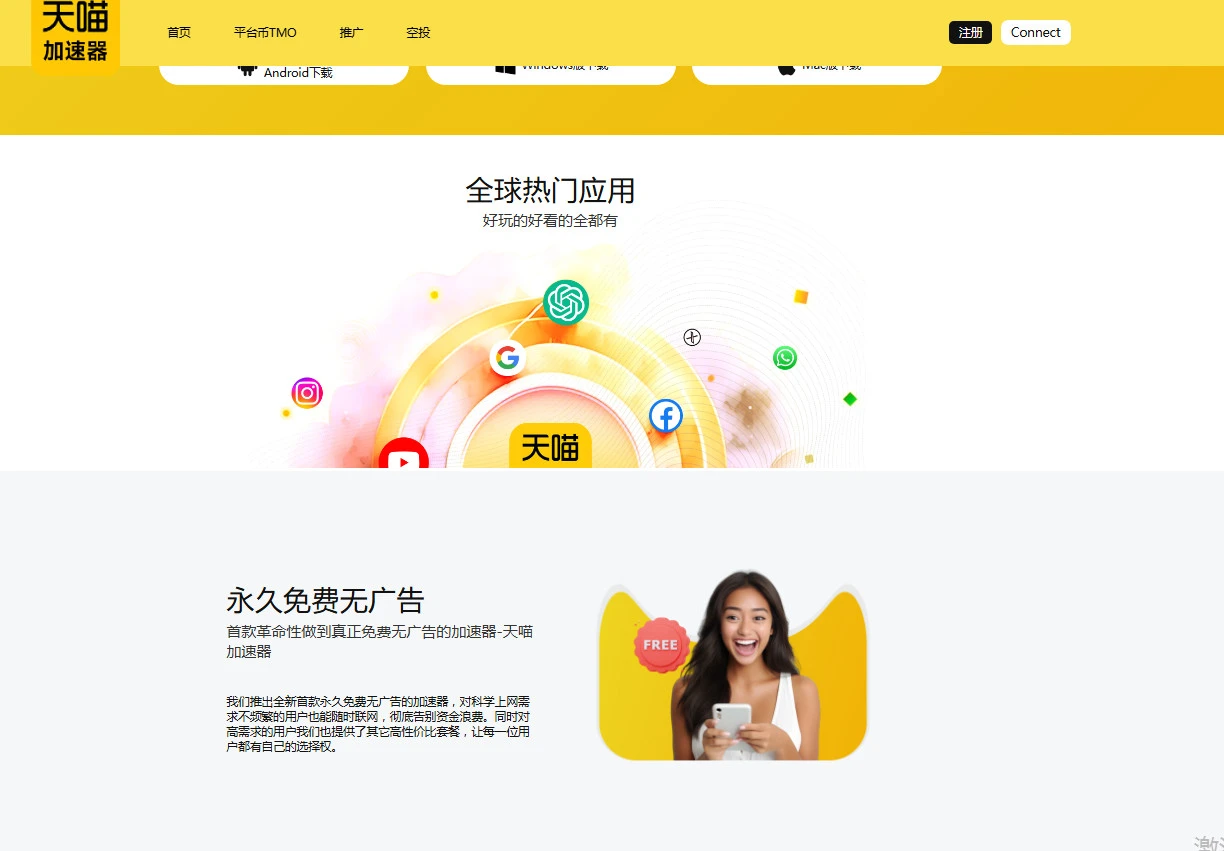 「天喵加速器」是一款专注于网络加速与隐私保护的跨平台应用,致力于为用户提供高速、稳定、安全的网络环境。它不仅满足了流媒体观看、海外应用访问、社交平台使用等需求,还强调永久免费与无广告体验,打造出一个实用性与便捷性兼具的工具型APP。